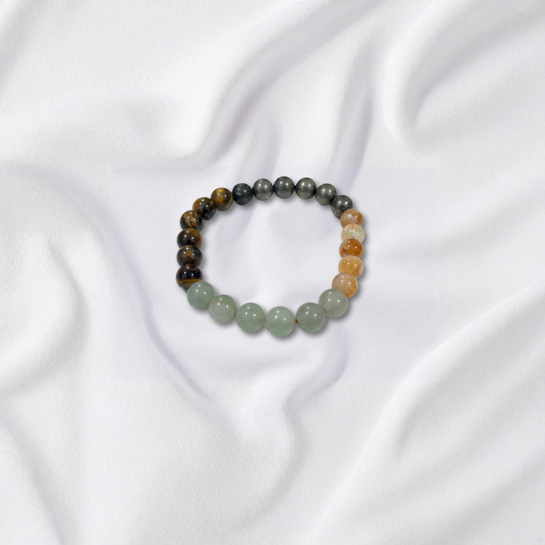 This bracelet blends the energies of Citrine, Green Aventurine, Tiger Eye, and Pyrite — the